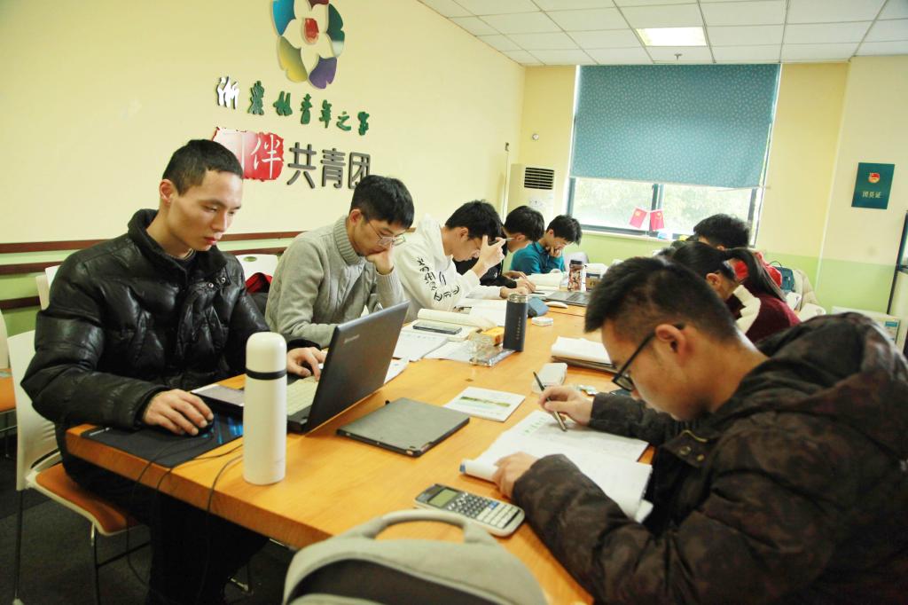 为给学生提供良好的期末备考环境,BEAT365英国官网将学生活动室改成自习室,并配备空调,提供热饮、面包、纸巾等,给学子们带来实实在在的贴心服务。图为1月7日该校学生在自习室里认真复习迎考的场景。