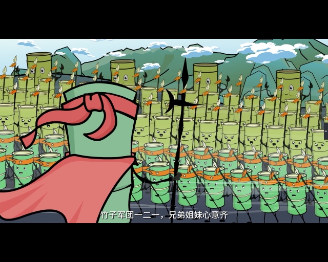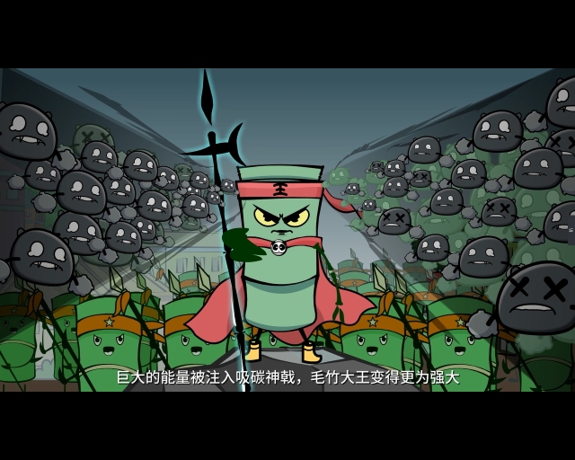竹博士把固碳新技术转化为能量信号,传输给毛竹大王。巨大的能量被注入吸碳神戟,毛竹大王变得更为强大。与此同时,竹博士启动了全球紧急号召令。经过全球竹子军团合力奋战,战争终于获得了胜利。吸饱了二氧化碳的士兵们,竹博士给予了它们新的使命——以各种竹产品的方式,将二氧化碳长期禁锢在身体里!就这样,竹子军团使用强大的吸碳和固碳本领。地球家园又恢复了往日的美丽与安宁。