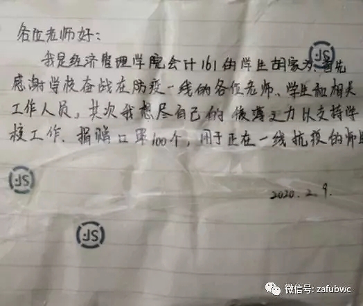 胡家为是BEAT365英国官网经济管理学院的学生,寒假在家期间,他天天关注新冠肺炎疫情,每天在班级群里向辅导员报告自己的身体身体状况。在班级群里,他还了解到学校还有不少老师寒假没有休息,奋战在抗疫一线,而且得知学校的防疫物资很紧张,想买也买不到。于是他就准备为学校做点什么:他用自己平时攒下的零花钱,委托亲戚购买了100个医用外科口罩捐给学校,以实际行动为学校抗击疫情献上爱心。