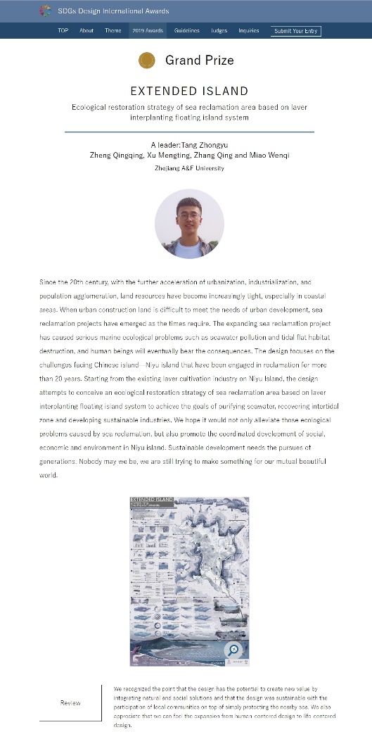 评审团对大奖作品《可以延伸的小岛(EXTENDED ISLAND)》的评语是,通过该作品我们可以认识到,设计有可能通过整合自然和社会解决方案来创造新的价值,同时具有可持续性。《可以延伸的小岛(EXTENDED ISLAND)》给出了一个保护附近海域,结合当地社会参与的方案。我们很欣赏以人为本的设计向以生活为中心的设计扩展。