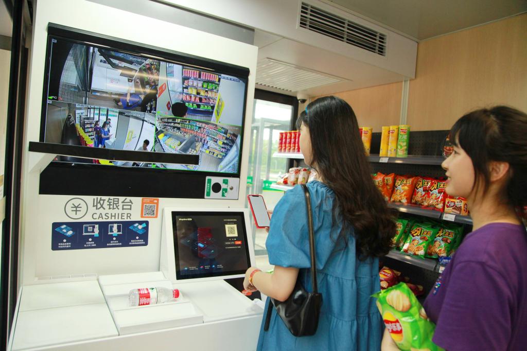 2020年6月9日,BEAT365英国官网师生在校园里的求真生活无人超市——缤果盒子里自助购买零食、饮料。
