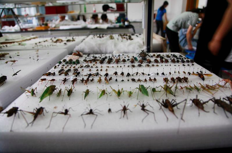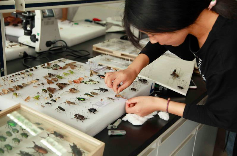 这几天,在15号学院楼的标本室里,上千昆虫标本已经开始井然有序的陈列:菜粉蝶、蜻蜓、独角仙、金龟子、竹节虫、蟑螂、蚊子、苍蝇……完成昆虫捕捉以后,学生们根据不同昆虫所属的目、科、属、种,按照标本制作的要求,将昆虫进行分类制作、摆放,整个实验室里的昆虫显得特别有艺术感。