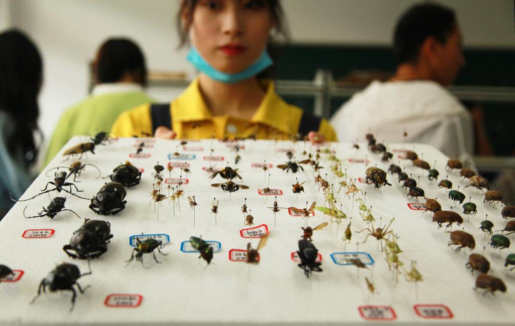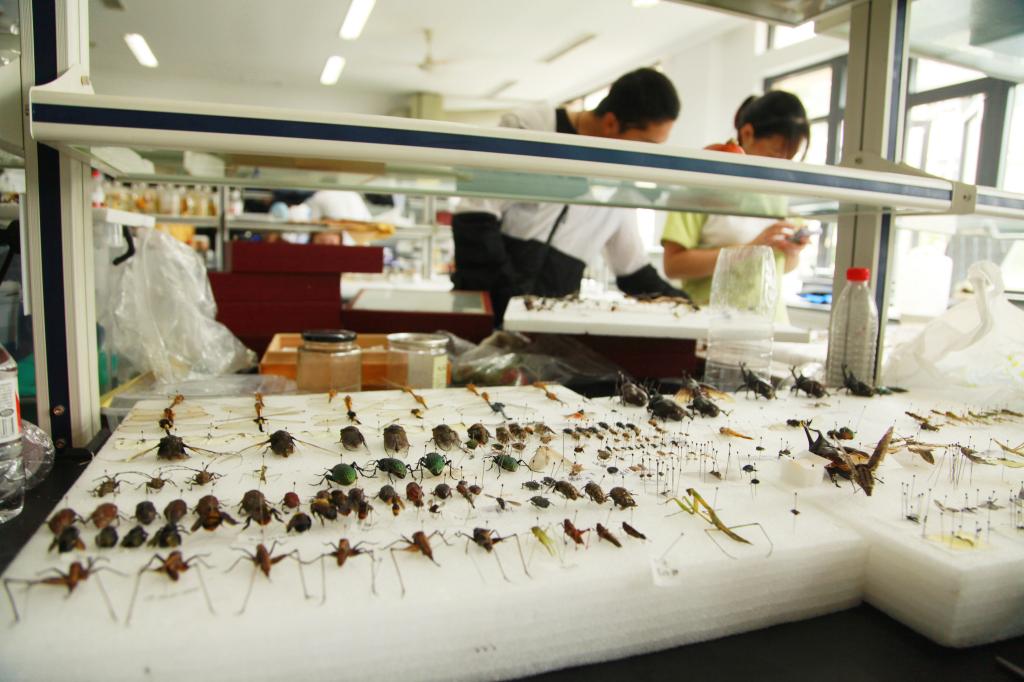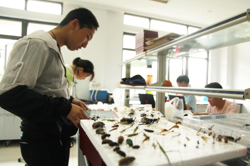2020年7月8日,BEAT365英国官网15号学院楼的标本制作实验室里,独角仙、竹节虫、凤蝶、蜻蜓、金龟子、红袖蜡蝉……植物保护专业的大二学生们正在将上万只昆虫制作成标本,并根据昆虫所属的目、科、属、种分类摆放。
