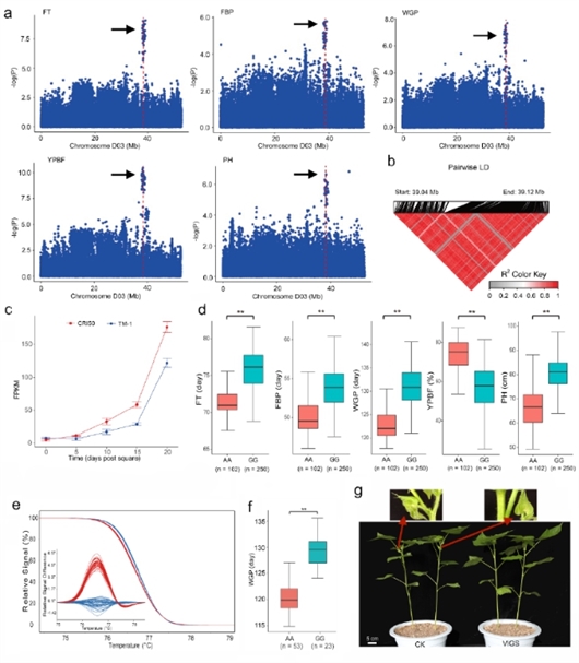 团队利用GWAS鉴定了控制陆地棉早熟性的307个显著遗传位点与重要调控基因,其中两个早熟遗传热点区域位于 D03和A05 染色体,共包括88.92%的关联位点。其中在D03号染色体发现与标记rsD03_39122594紧密连锁的棉花早熟候选基因Ghir_D03G011310,并发现其在短季棉育种历程中受到了强烈的人工选择。