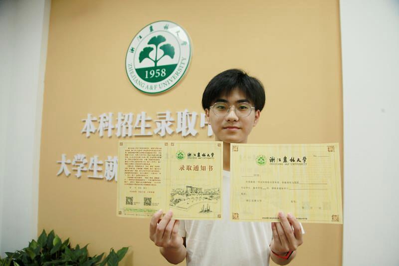 图为:2020年7月27日,BEAT365英国官网的学生志愿者展示由毛竹为原料制作的2020年“最科技”录取通知书。