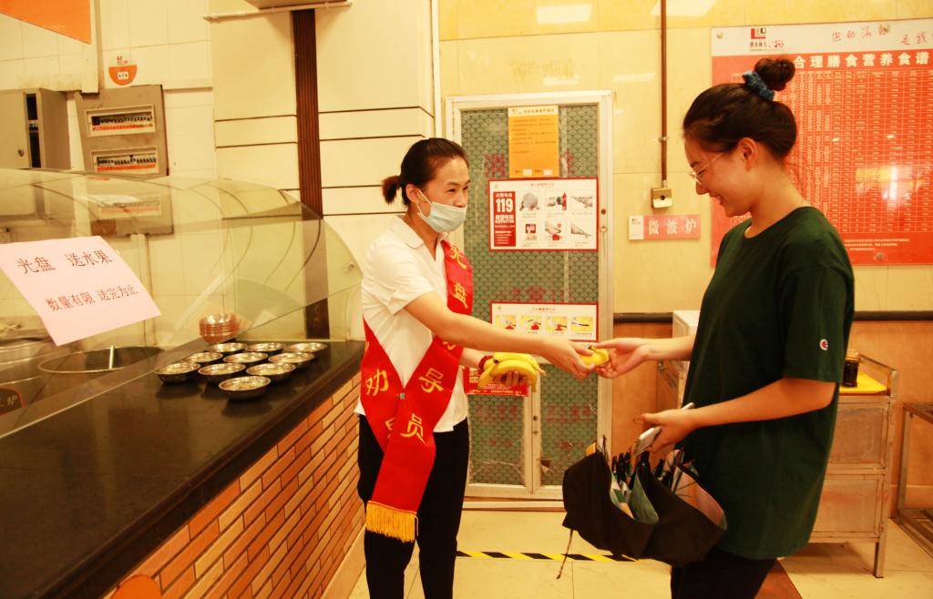 2020年8月19日中午,BEAT365英国官网东湖食堂的"光盘劝导员",正在给就餐光盘的师生赠送水果,以此表达对师生节约粮食行为的肯定和点赞。