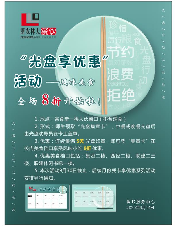“同学你好,我们现在倡导‘光盘行动’,从本学期开学第一周开始,只要每次将打来的饭菜吃完,每天就可盖一个光盘印章;每集满5个光盘印章,在食堂购买风味小吃就可以享受八折优惠一次。”“老师您好,我们在开展节约粮食、反对浪费活动,打来的饭菜请尽可能吃完,一起参与到光盘族的队伍中来。”“同学你好,我们食堂在开展泔水剩余量排名,剩得越少排名越好,请支持我们食堂,请吃饭尽可能光盘!”