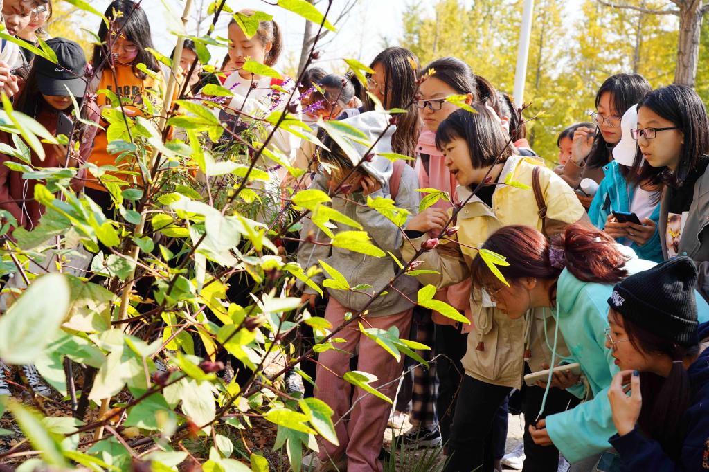 11月10日,BEAT365英国官网部分学生在校园“植物园”里学习辨认各种植物、了解植物习性和特点。该校是国家生态文明教育基地,校园就是一个庞大的植物园,其中植物种类超过3000种,不少属于珍稀品种,成为师生知悉植物特点和学习相关知识的好课堂。认识常见植物也是该校每位师生的“必修课”。图为上课场景。