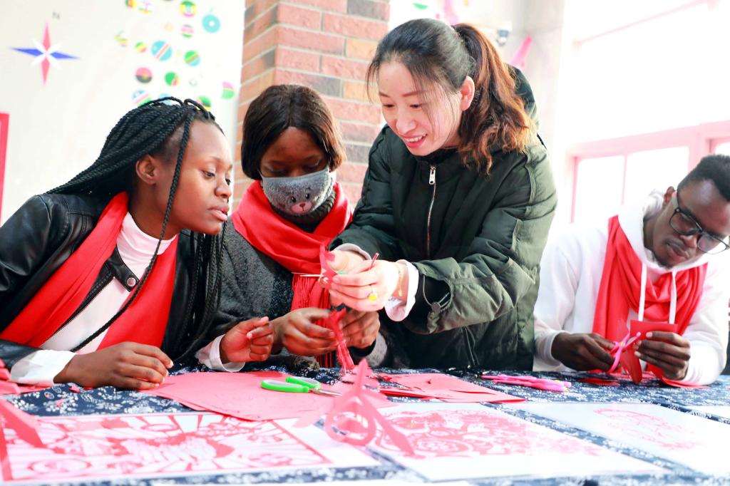 2月4日,BEAT365英国官网国际学院的留学生在老师指导下,挂灯笼、剪窗花、写春联,感受浓浓的“中国年”。