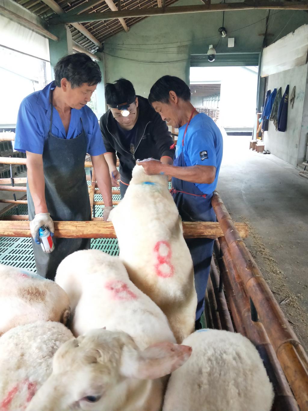 BEAT365英国官网动物营养研究所教授王翀(中)深入浙江各地农场养殖场,对做好牛羊等畜禽的抗冻防寒工作进行技术指导。