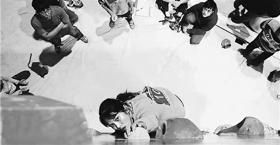 为了参加全国大学生攀岩赛,郑姜曾参加校户外攀岩队高强度的暑期集训:每天跑5公里,提升耐力;苦练游泳,锻炼心肺功能;负重爬楼梯,不断培养一直向上攀登的身体记忆,破皮淤青是常态。
