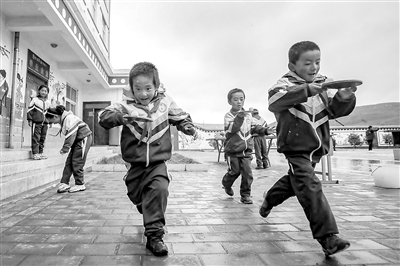 甘肃省甘南藏族自治州合作市佐盖多玛乡仁多玛小学学生在进行课间趣味游戏。
