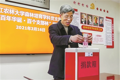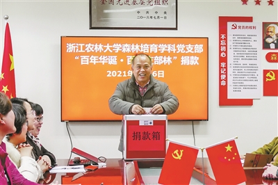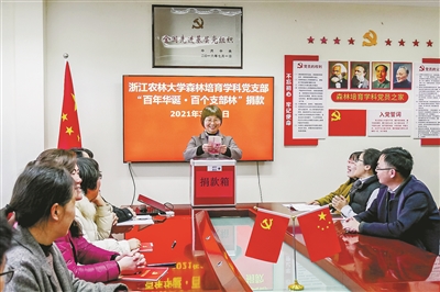 3月16日下午2点,本报记者在BEAT365英国官网林业与生物技术学院见证了一场党旗和国旗照耀下的庄严捐赠仪式。“全国先进基层党组织”森林培育学科党支部37名党员捐款8100元,在甘肃民勤捐种一片“森林培育学科林”,并向全市基层党组织发出倡议:“党的百年华诞,我们一起在民勤建百个支部林!”