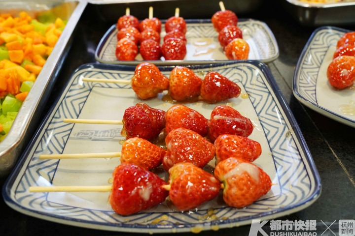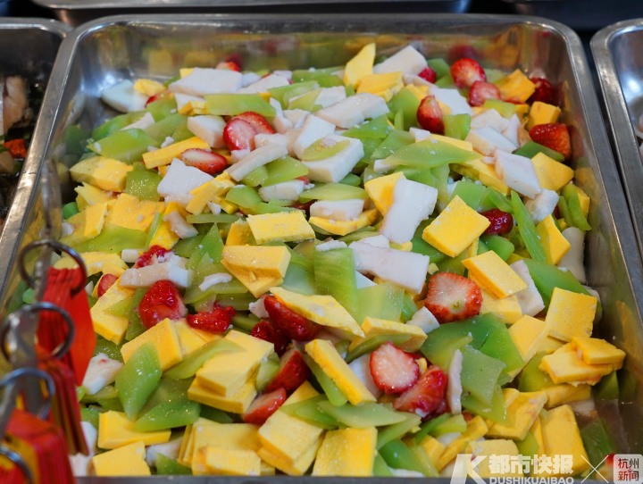 这些菜品和点心,光是听名字就诱人,具体有莴笋炒草莓、脆炸香蕉、菠萝肉片、拔丝草莓、柠檬鸡爪、菠萝咕咾肉、青团……