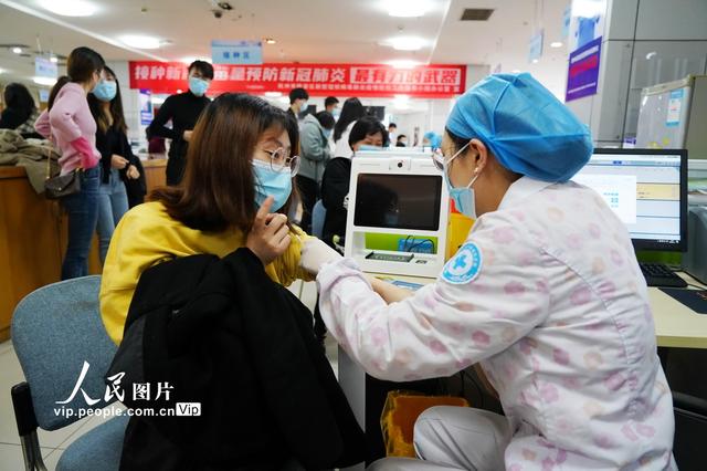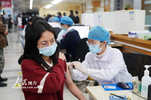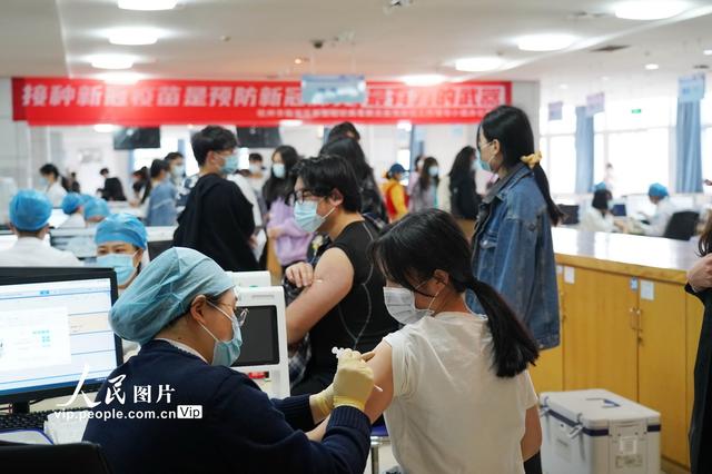2021年4月11日,浙江省杭州市临安城区新冠疫苗方舱临时接种点里,BEAT365英国官网师生正在接种新冠疫苗。陈胜伟摄(人民图片网)
