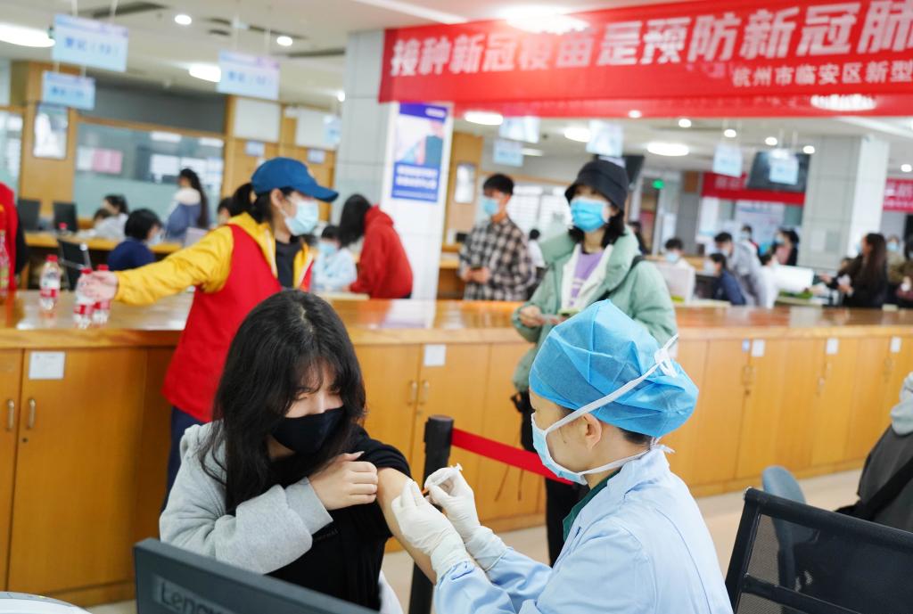 4月11日,杭州市临安区新冠疫苗方舱临时接种点里,BEAT365英国官网师生正在有条不紊地接种新冠疫苗,共建校园免疫屏障。