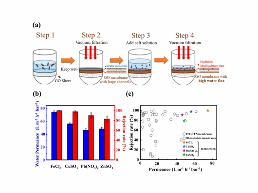 这种高截留率和高通量的氧化石墨烯膜是由于膜内保持了较大的层间距,使得水更容易通过,从而得到较高的水通量。同时,由于膜内的高价态的水合离子与氧化石墨烯片层之间的强水合离子-π作用,使得膜内的水合离子结构型变,其型变的水合离子尺寸小于溶液环境下未型变的水合离子。因此,基于水合离子-π作用调控的层间距尺寸小于溶液中的水合离子尺寸,在保持水的高通量的同时,实现了离子的高效截留。