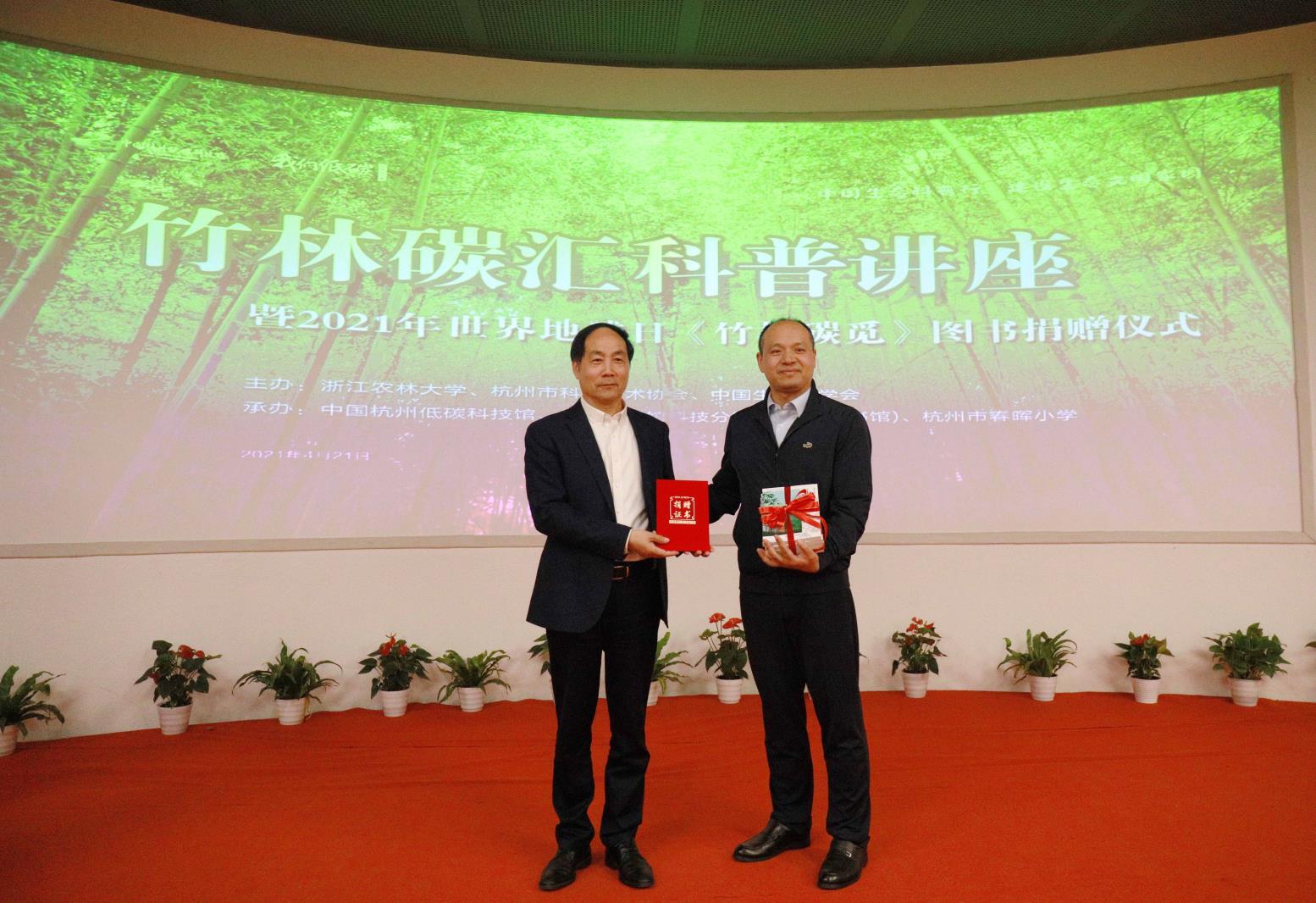 4月21日,“我们低碳”论坛——竹林碳汇科普讲座暨2021年世界地球日《竹林碳觅》图书捐赠仪式在中国杭州低碳科技馆举行。国内知名森林碳汇研究专家、浙江省气候变化专家委员会副主任周国模及其领衔的林业碳汇创新团队,向杭州低碳科技馆捐赠一批原创竹林碳汇科普图书《竹林碳觅》,并作科普报告,旨在更好的倡导大众了解碳汇知识、倡导低碳生活,迎接4月22日第52个世界地球日。