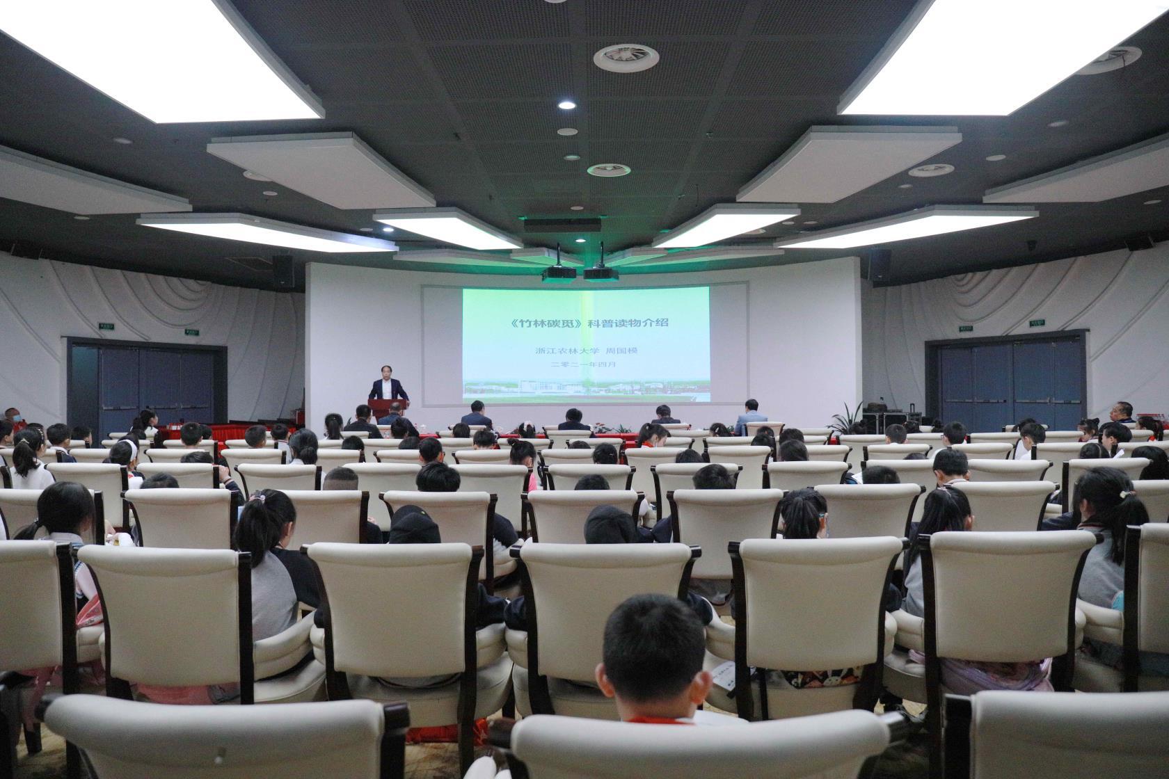 当天周国模教授团队捐赠的科普图书《竹林碳觅》,是“竹林碳觅”系列科普作品的主要组成部分,适合各类群体读者阅读。来自杭州市春晖小学的几十名学生代表,现场聆听了精彩的讲座,并率先得到了《竹林碳觅》等读物。《竹林碳觅》全书共分八章,分别取名碳来碳去,识竹问碳,吸碳之王,藏碳之道,寻碳之踪,增碳之术,竹君卖碳,碳明未来。全书以碳贯穿始终,因碳遁序探秘,采用科学、生动、简洁的语言,以图文并茂、通俗易懂、循序渐近的方式生动讲述了大气中二氧化碳的产生、控制与气候变化的关系,竹子家族全生命周期的神奇固碳特征,以及人们如何提升竹林固碳能力,携手应对气候变化共创美好未来的科学知识与技术,最后积极引导公众参与竹林碳汇、践行低碳生活发出人人行动,共同呵护美丽地球家园、共建人类命运共同体的深深呼唤。