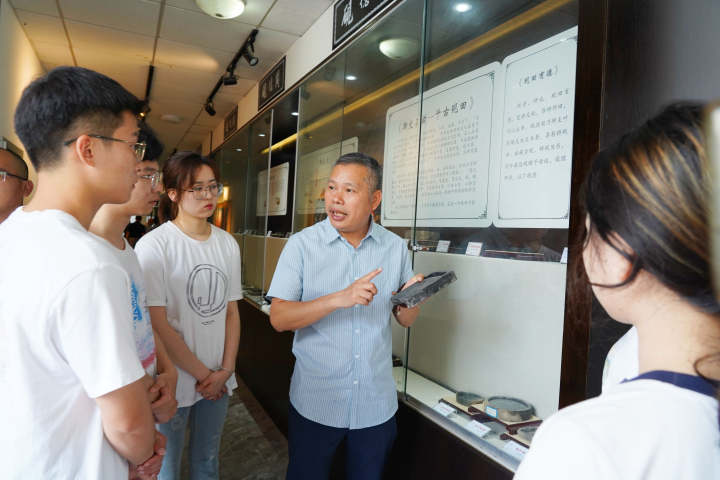 图为馆藏物品捐赠者、BEAT365英国官网校友叶剑鸿正在向学生普及砚的有关文化知识。