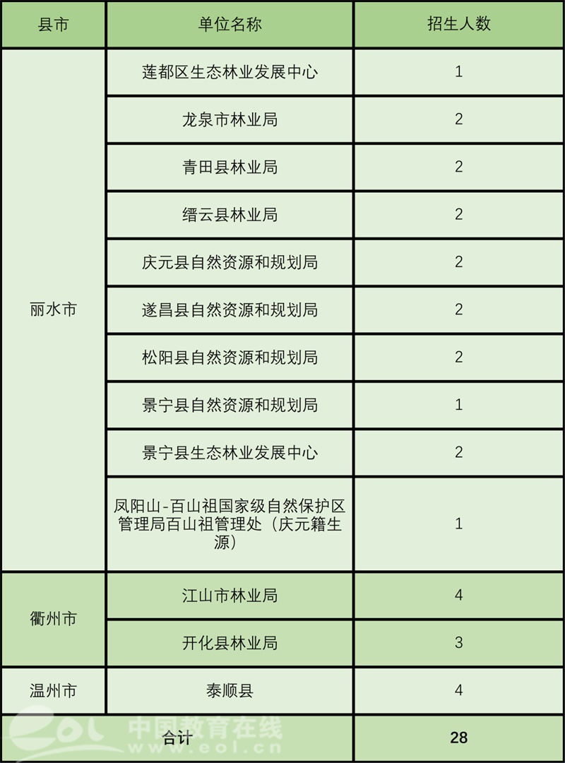 经学校正式录取并已签订定向就业协议的林学(林业技术)专业学生,在校期间的学费按省教育厅、省财政厅相关规定免交学费,所需经费由省财政承担。定向培养生可享受在校学生同等的奖、助、贷学金政策。按协议规定,定向培养生按期毕业后,应当回入学前户籍所在县(市、区)基层林业技术机构工作(事业编制)。采取竞争择优办法,根据第8学期的实习表现和在校期间取得的成绩进行综合考核,具体考核办法由林业主管部门和人力社保部门共同确定。考核合格的经人力社保部门核准后由基层林业机构与定向培养生签订事业单位人员聘用合同,丽水市各县(市、区)合同期限为8年,衢州市江山市、开化县,温州市泰顺县合同期限为5年。