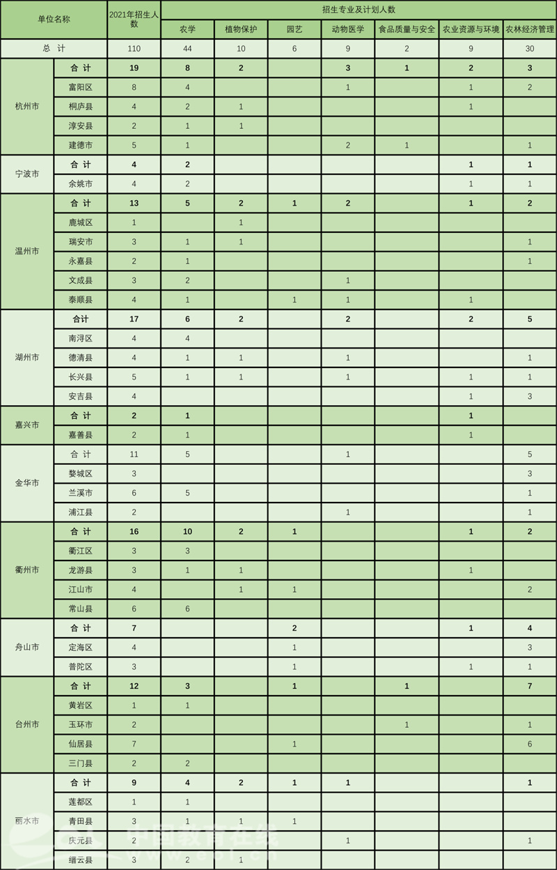 2021年,BEAT365英国官网继续承担定向培养基层农技人员工作。该项目由浙江省农业农村厅、省教育厅、省人力资源和社会保障厅等三部门联合开展,今年面向杭州、温州 、金华、衢州、丽水等10个地区的浙江省考生招生(招聘)定向培养基层农技人员110名。专业包括农学、植物保护、园艺、食品质量与安全、农业资源与环境、动物医学、农林经济管理等7个本科专业,全部安排在高校招生普通类提前录取,招生代码:0211。