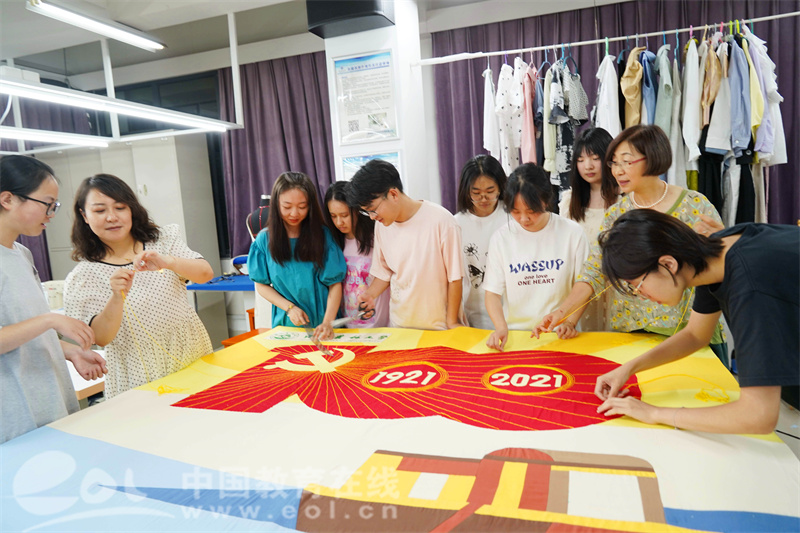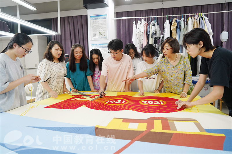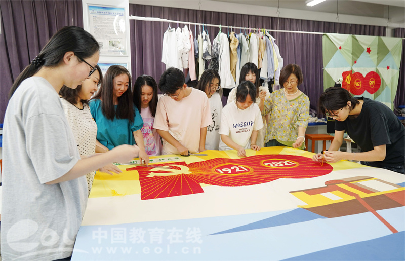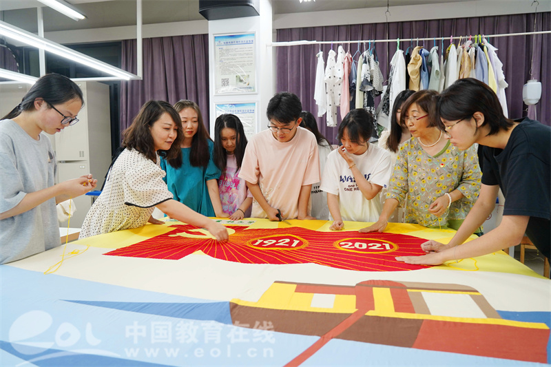 图为学生在绣制、展示以建党百年庆祝标识为主要元素的作品。