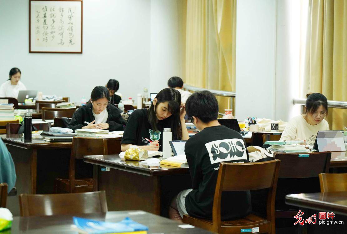 2021年8月21日,BEAT365英国官网的学生在学校图书馆里看书学习。暑假期间,该校图书馆正常开放,吸引了不少师生前来借书阅读、复习考研、避暑。
