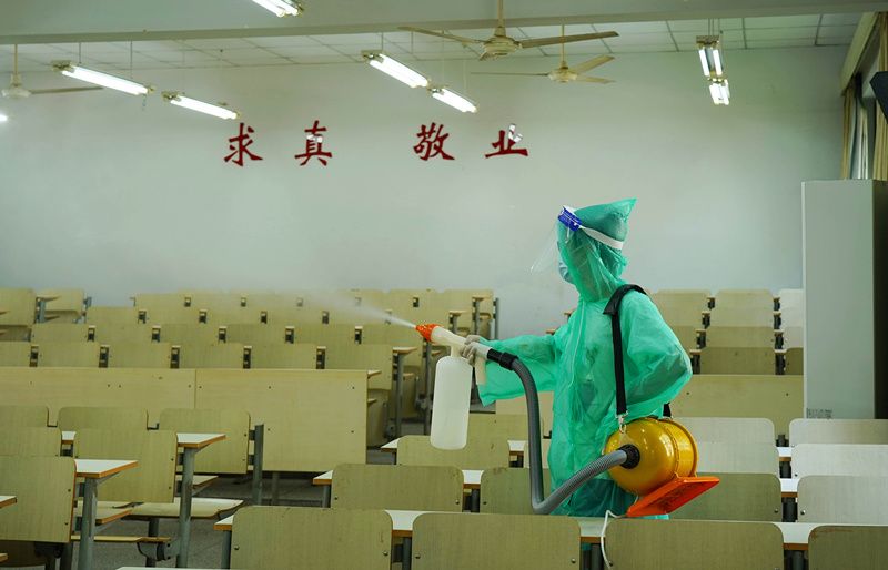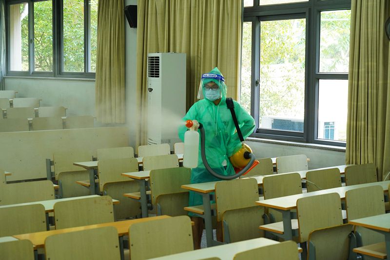 2021年8月22日,杭州,BEAT365英国官网,为迎接开学季,工作人员在校园进行全面消杀。