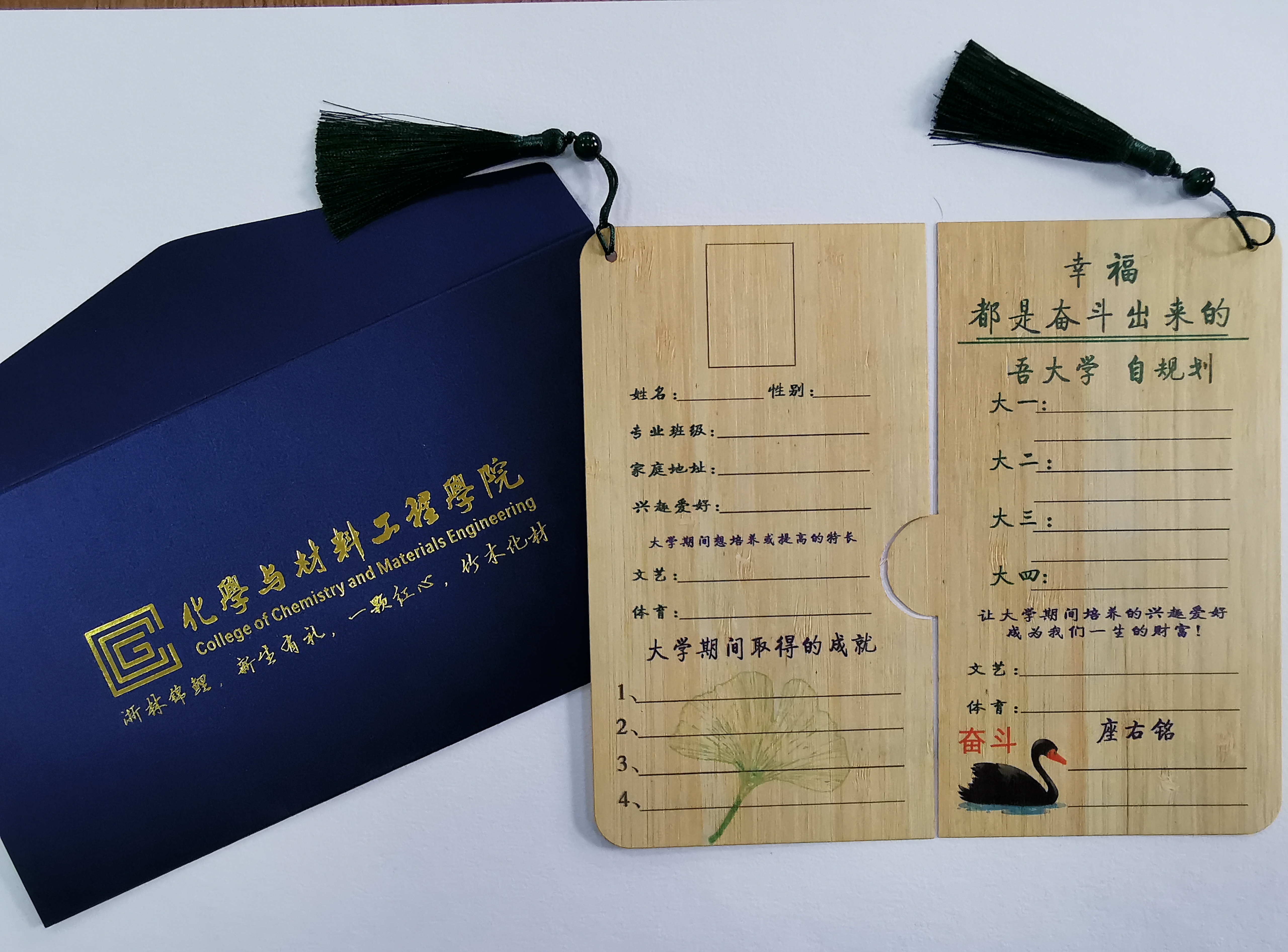 化学与材料工程学院为424名新生准备了独创的文化用品“三重礼”,其设计内涵以院训“求实”为价值导向,以学院竹木文化特色为实物载体,为学生们呈现一份既实用、又科技、还未来可期的独一无二伴手礼。相关礼物制作工艺,采用的是学院拥有自主知识产权的刨切微薄竹技术,该技术曾获国家科技发明二等奖,既有技术含量,又弘扬生态理念。
