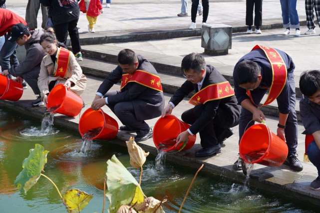在面积超过100亩的东湖边,生态鱼苗放养活动正在举行,东湖也成为了天然的生态课堂。伴着一阵欢呼声,十多位志愿者把小鱼苗放进东湖中,一条条小鱼在水中欢快跳跃着游向远处。此次共投放鱼苗4000尾,包括草鱼、鲢鱼、鳙鱼、鳊鱼等品种,可以有效地通过“以水养鱼、以鱼净水”,防治藻类和富营养化现象,增加生物多样性,增强水体自净能力。