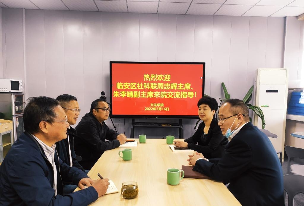 3月16日,临安区社科联主席周忠辉、副主席朱李靖一行到文法学院交流指导。文法学院院长鲁可荣对客人到访表示欢迎,并简要介绍了学院情况。
