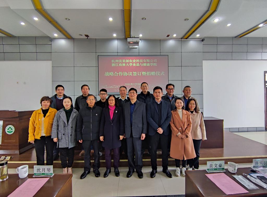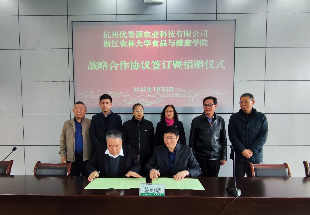3月23日上午,食健学院与杭州优果源农业科技有限公司(以下简称公司)签订战略合作协议。校党委委员、副校长沈月琴,临安区经信局原局长汪其顺,临安区科技局党组书记黄文豪,龙岗镇党委委员、常务副镇长赵一听、公司董事长徐南汉,临安区科技局领导陈玉、杜漾丹,临安区商务局领导罗娅娟、学校校友办主任杨黎明,学院院长斯金平,学院党委书记汪和生及师生代表等参加仪式。