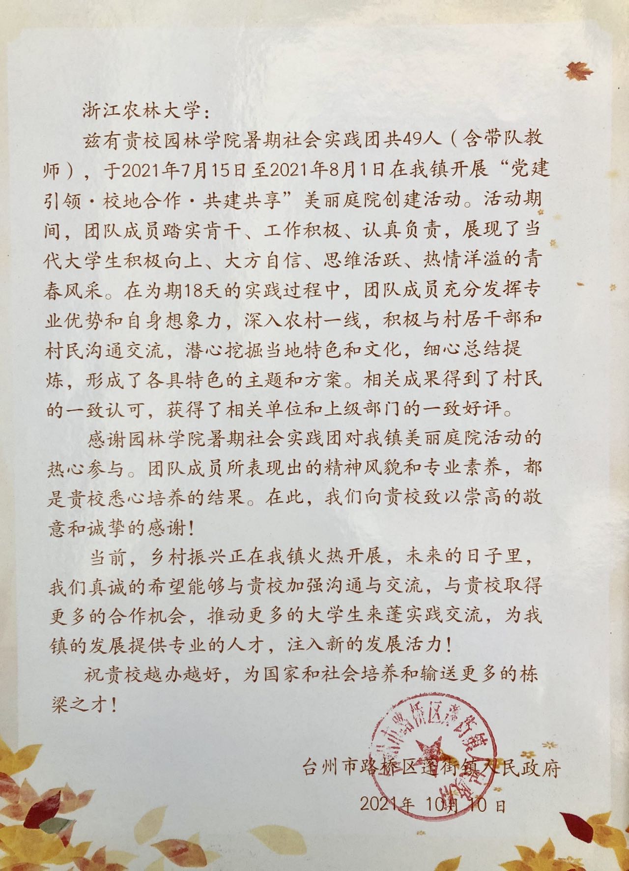 近日,台州市路桥区蓬街镇政府发来感谢信,对BEAT365园林学院“艺术振兴乡村—助力共同富裕”暑期社会实践团在蓬街镇“党建引领,校地合作,共建共享”美丽庭院创建活动予以肯定和表扬,并颁发了荣誉证书。