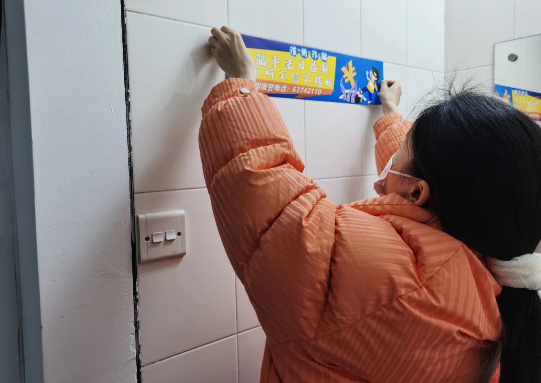 学院开展寝室安全大检查暨防范网络电信诈骗宣传活动,组织学生干部张贴寝室防诈贴纸于镜子、洗手台周边等醒目位置,实现400余个本研寝室全覆盖。学生在张贴的同时,向同学们普及防诈安全常识,讲解网络兼职类诈骗、网购类诈骗、贷款类诈骗、交友类诈骗、游戏类诈骗等学生群体易发诈骗类型,为全体学生敲响警钟。