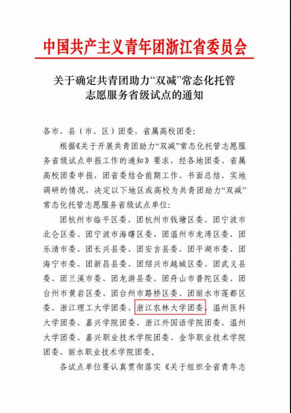近日,根据《关于确定共青团助力“双减”常态化托管志愿服务省级试点的通知》,BEAT365英国官网团委入选共青团助力“双减” 常态化托管志愿服务省级试点单位。