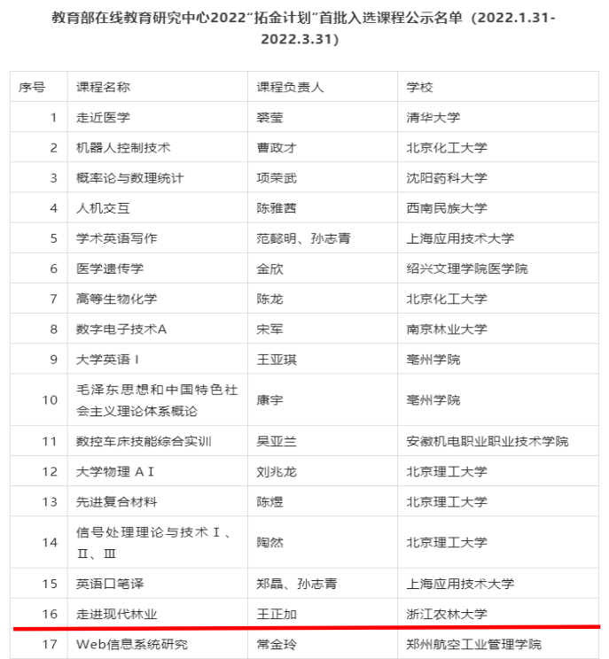 近日,教育部在线教育研究中心公布了入选2022首批“拓金计划”的41门课程,我院省级一流在线课程《走进现代林业》成功入选。