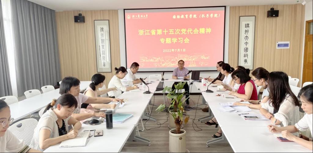 7月1日下午,国际教育学院(孔子学院)院长赵有华主持召开专题学习会,深入学习贯彻省第十五次党代会精神,全体教职工参加。会议学习了中国共产党浙江省第十五次代表大会的重要精神,总结了学院新一轮岗聘工作,部署了暑期相关工作。