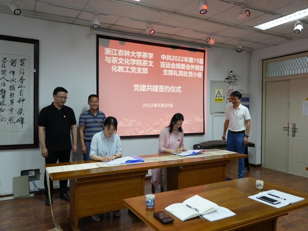 在两支部共建签约仪式上,茶文化教工党支部书记钟斐和19届亚运会组委会外联部支部礼宾处薛闻琦代表双方签署了共建协议。双方均表示将坚定信心,实现以党建凝聚双方力量,为办出一届“中国特色、浙江风采、杭州韵味、精彩纷呈”的亚运会贡献力量。