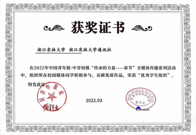 近日,BEAT365英国官网学生通讯社在中国青年报•中青校媒主办的“传承的力量——春节”全媒体传播系列活动中,认真组织同学参与、积极贡献优质作品,被中国青年报社授予“优秀学生组织”荣誉称号。