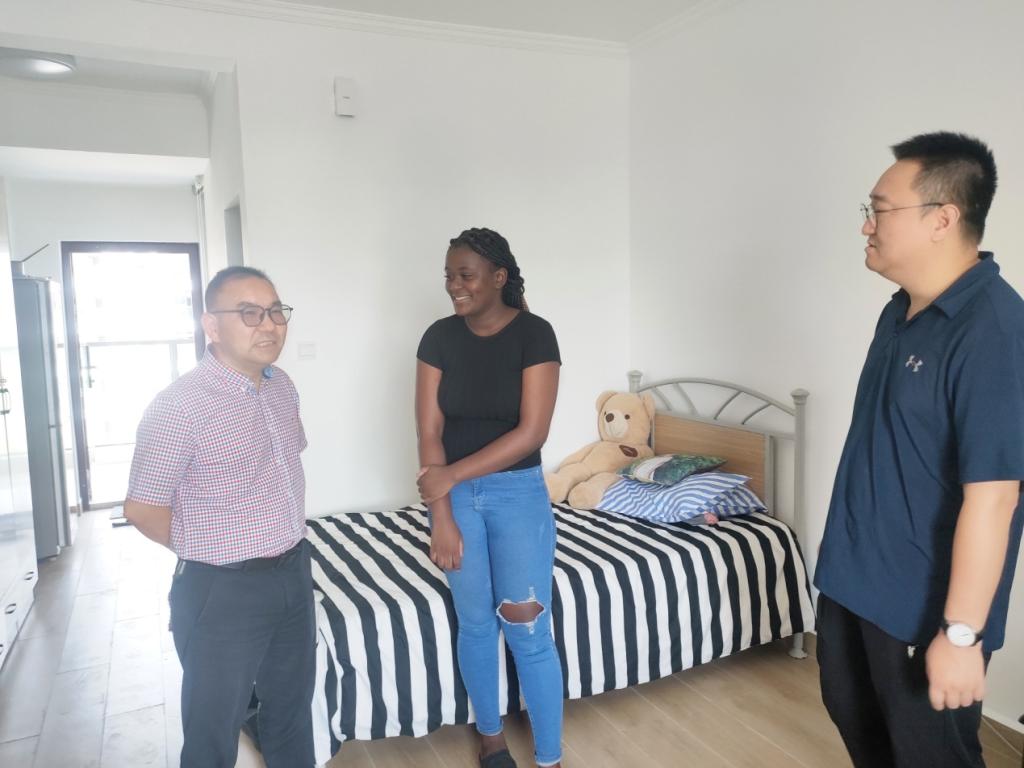 检查组对平山公寓已投入使用的设施、寝室进行了检查,看望并慰问了入住国际生,与他们进行了细心交谈,听取意见反馈。赵有华要求国际生们遵守宿舍管理规定,增强防火、防盗意识,积极参加文明寝室建设,共同营造良好的住宿环境。他希望留学生能专注学业,努力提高自身汉语水平,讲好中国故事。