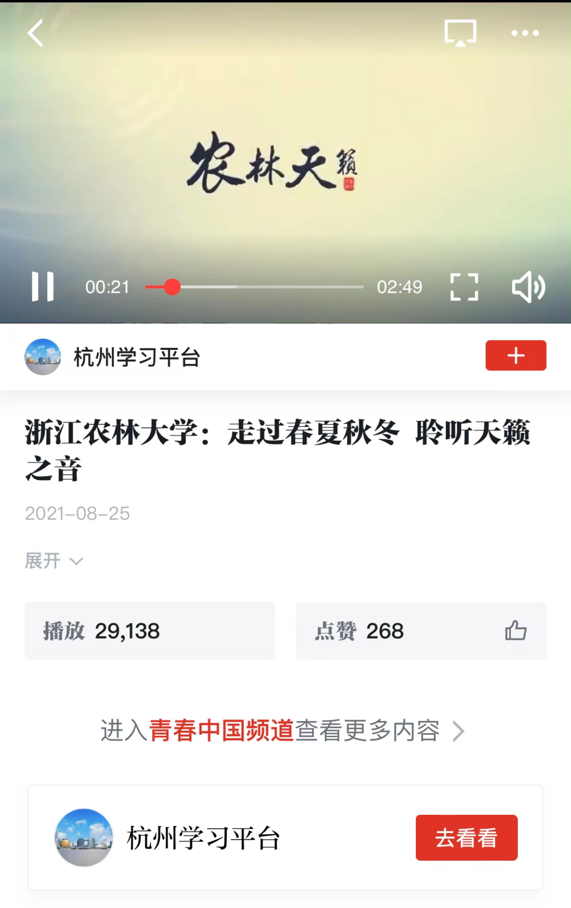 《农林·天籁》在学校视频号发布之初,便引发了校内外师生和校友的高度关注和转发,不到2天时间,观看量就突破了20万,点赞量近6000,转发量超2000,在浙江、河南、安徽、江苏、上海、香港等城市和地区的10000多用户中引起了广泛传播,在学习强国平台的杭州学习平台播放量达到29138。