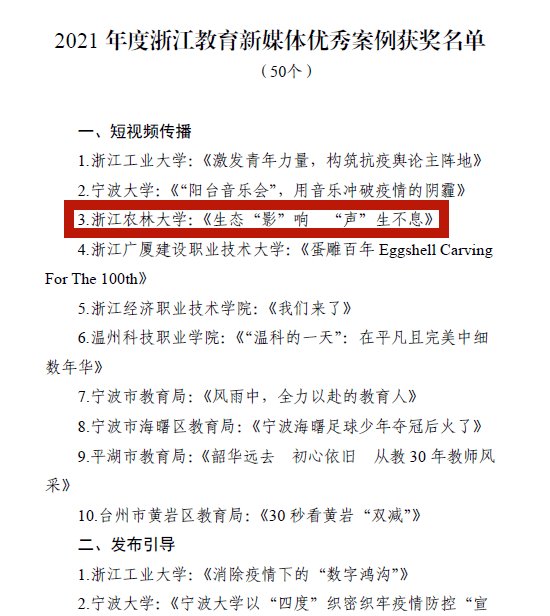 近日,浙江省教育厅公布2021年度浙江省优秀教育新媒体评选活动获奖名单。BEAT365报送的视频号作品《生态“影”响 “声”生不息》,荣获短视频传播类优秀案例奖。全省教育系统共10个短视频获得该奖项。