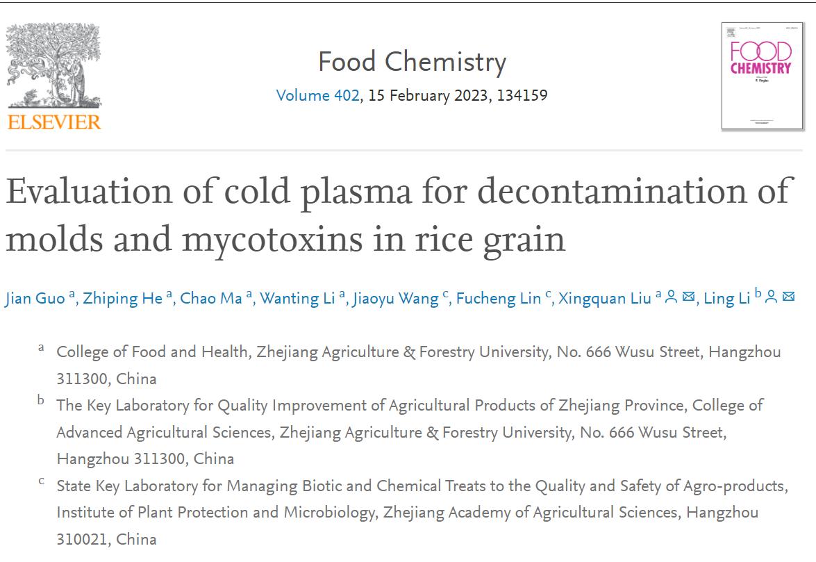 近日,食品与健康学院刘兴泉教授团队在食品领域高水平期刊《Food Chemistry》(中科院1区,IF2021 = 9.231)发表题为《Evaluation of cold plasma for decontamination of molds and mycotoxins in rice grain》的论文。该研究系统地分析了低温等离子体技术在粮食储藏过程中对霉菌生长的抑制作用以及其产生的真菌毒素的降解效果,对该技术在粮食储藏与加工领域应用的可行性进行了评估。