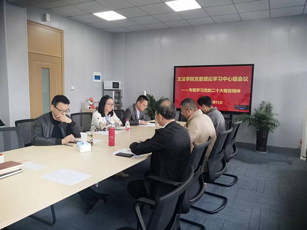 10月17日下午,文法学院党委理论学习中心组在实验楼612会议室召开学习会,专题学习习近平总书记在党的二十大会议上的报告精神。学院党委理论中心组成员参加学习。