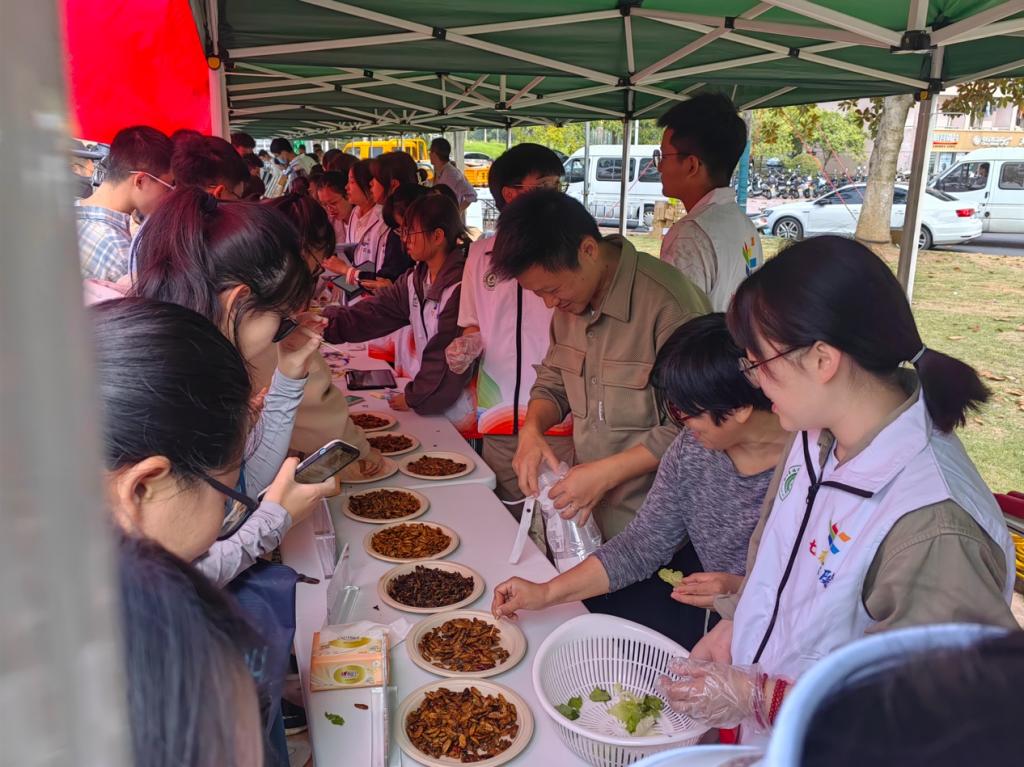 在昆虫美食品尝环节,大家争相品尝蝉、蚕蛹、蝗虫、蜂蛹等11种食用昆虫美食,尝试感受特别的“美食盛宴”。