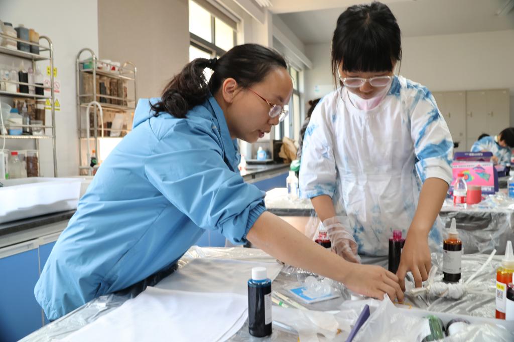 扎染工艺是中华民族传统文化之一。其基本流程分为扎结和染色两部分,先用线在被印染的织物打绞成结后,再进行印染,然后把打绞成结的线拆除,形成独特的图案。教职工们以家庭为单位,组成亲子课堂小组,在指导老师的帮助下,通过运用多种不同的扎染表现技巧来体验“布”一样的精彩,感受传统文化的独特魅力。