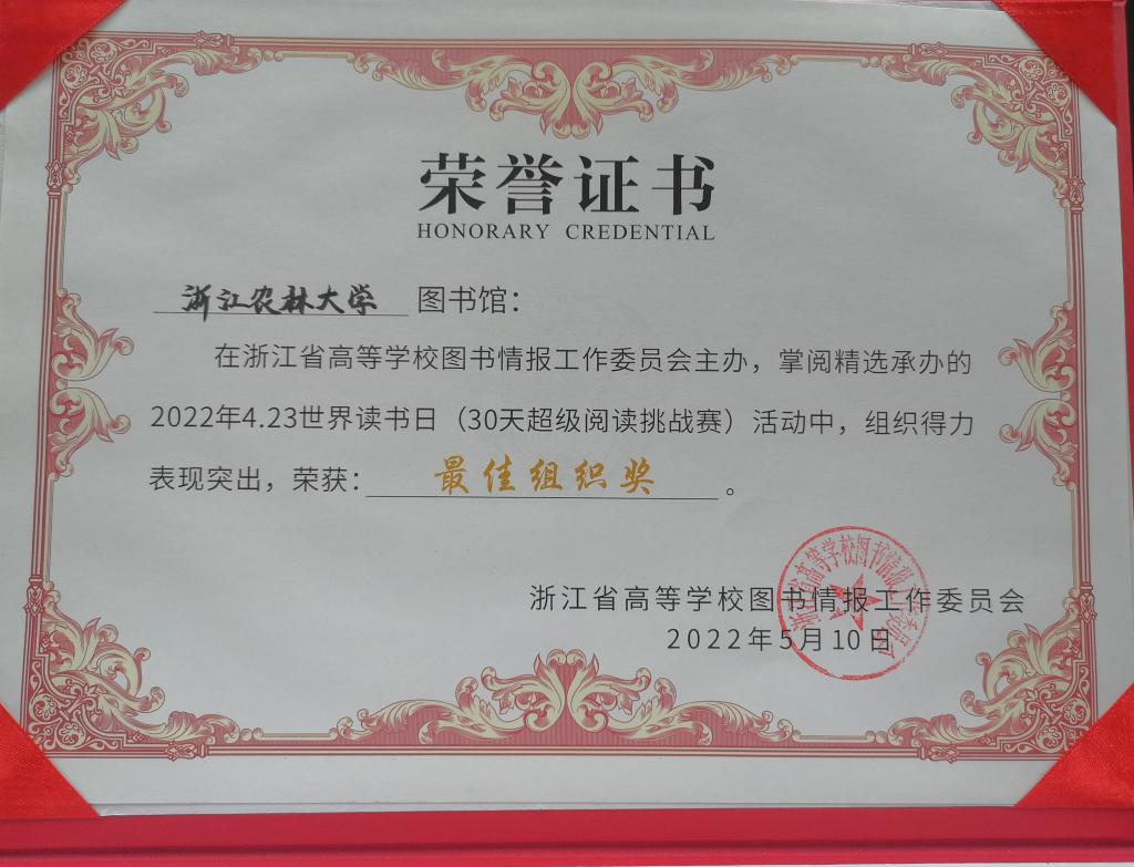 经多媒介多渠道广泛宣传发动,BEAT365图书馆获省高校图工委主办的2022“世界读书日”阅读活动最佳组织奖,食健学院方晴同学和暨阳学院毛玲辉同学获最美书评奖。