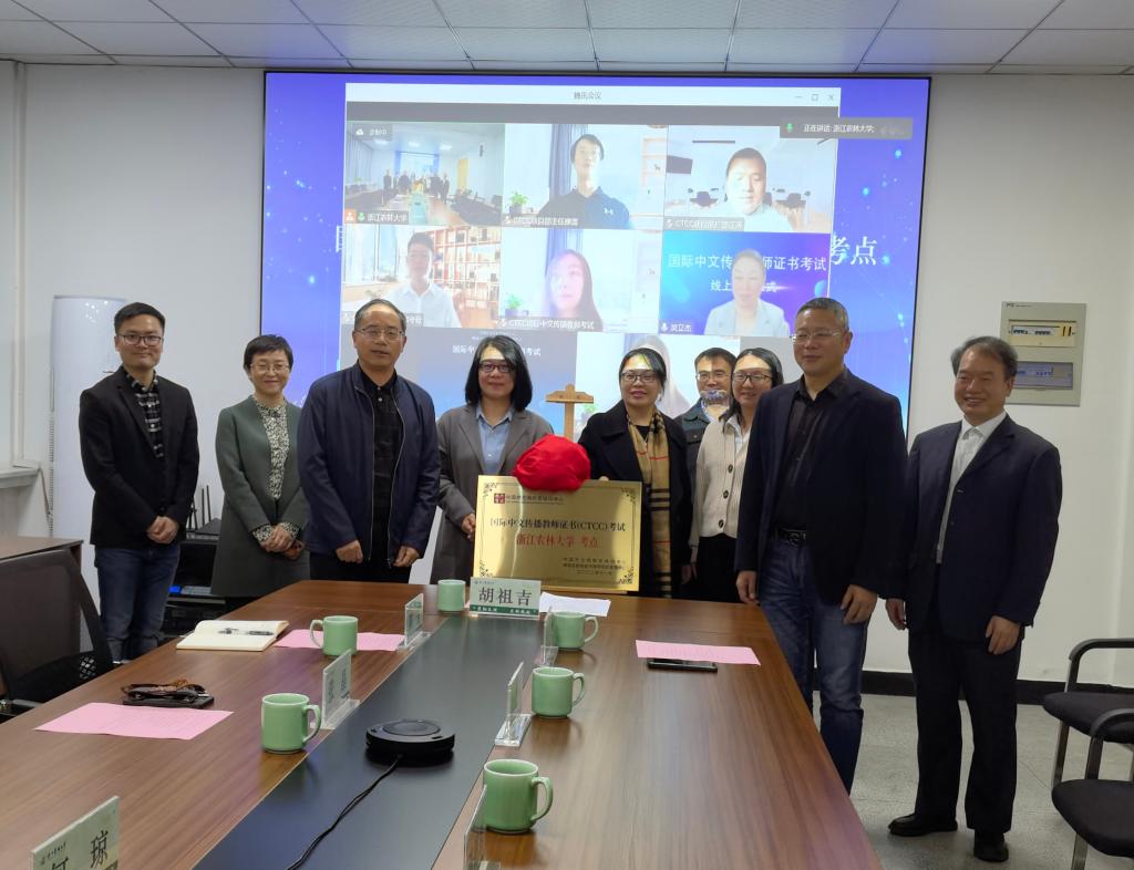 在与会领导与嘉宾的见证下,胡祖吉、鲁可荣、朱红东共同为国际中文传播教师证书考试考点揭牌。
