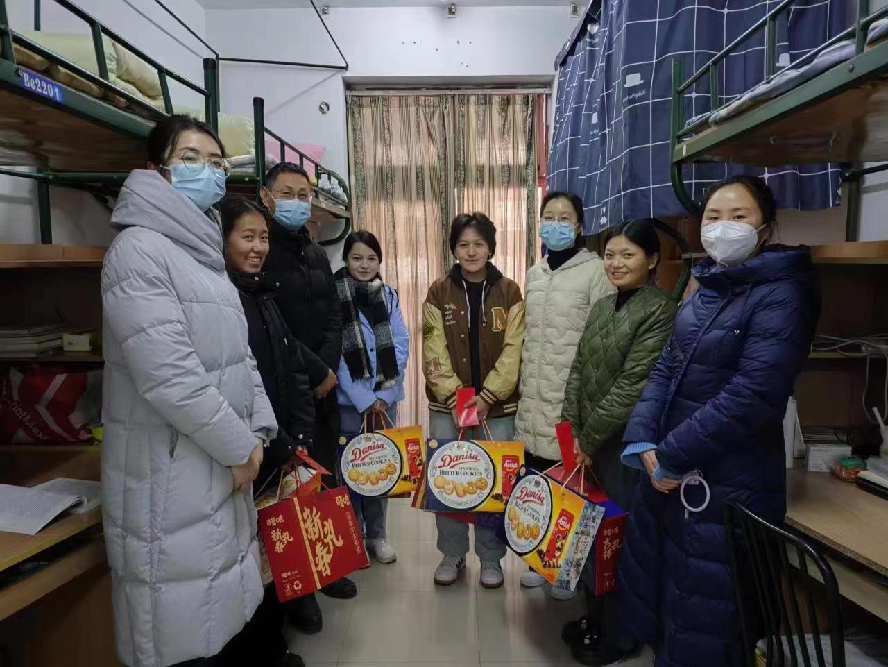1月10日,食健学院党委书记、副书记与辅导员一同深入学生寝室看望慰问寒假留校学生,并代表学院送上慰问大礼包和新春祝福。
